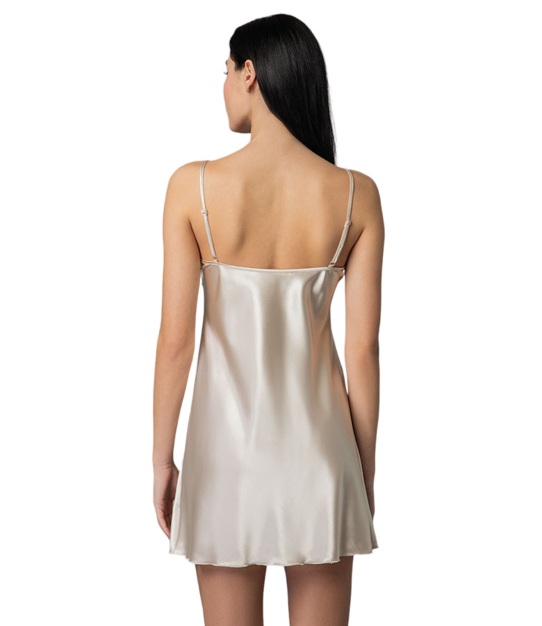 Γυναικείο νυχτικό από πολυτελές σατέν ύφασμα με κομψό V κόψιμο στο ντεκολτέ και ρυθμιζόμενες τιράντες. Σετ με ασορτί string.