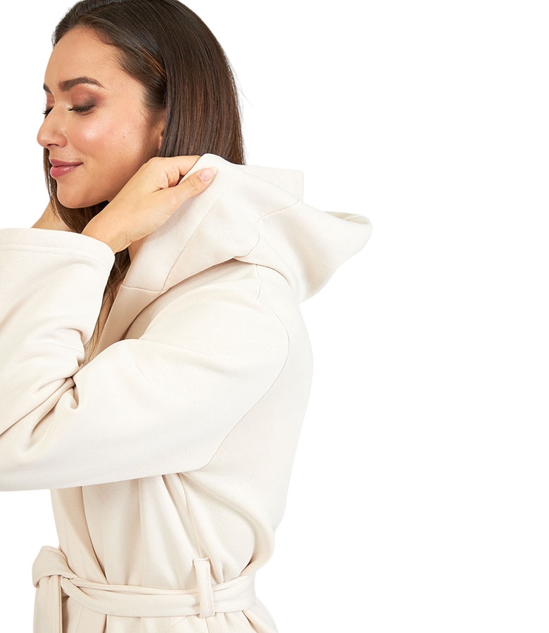 Καθημερινή ρόμπα φούτερ με ζεστή χνουδωτή επένδυση. Διαθέτει κουκούλα και εξωτερικές πλαϊνές τσέπες. Σταυρωτή με μήκος πάνω από το γόνατο και γιακά. Κατασκευασμένη από ζεστό, μαλακό ύφασμα που επιτρέπει στο δέρμα να αναπνέει. Σύνθεση: 65% Cotton, 35% Polyester